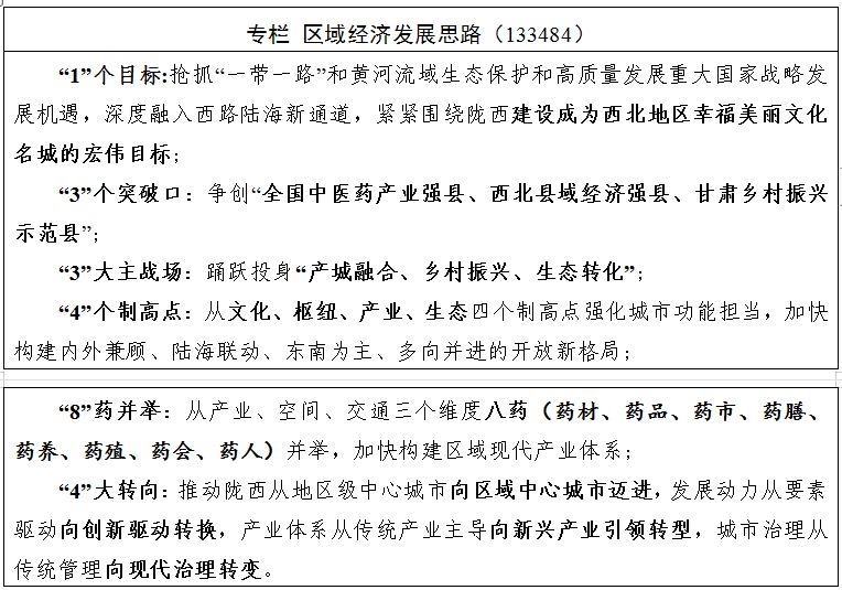 ——建设中国药都。立足“千年药乡”、“西北药市”和“天然药仓”的资源优势,以中医药全产业链标准化生产和转型升级为目标,以中国甘肃·陇西中医药信息物流港为载体,以中医药循环经济产业园为平台,推进中药材产业向中医药产业、大健康产业全面转型,持续办好国家中医药产业博览会,把陇西建成全国大宗道地中药材生产基地、国家中药原料药生产供应保障基地、国家中药材战略储备基地、国家中医药产业发展综合试验区核心区和国家西部中药材现期货交易中心。