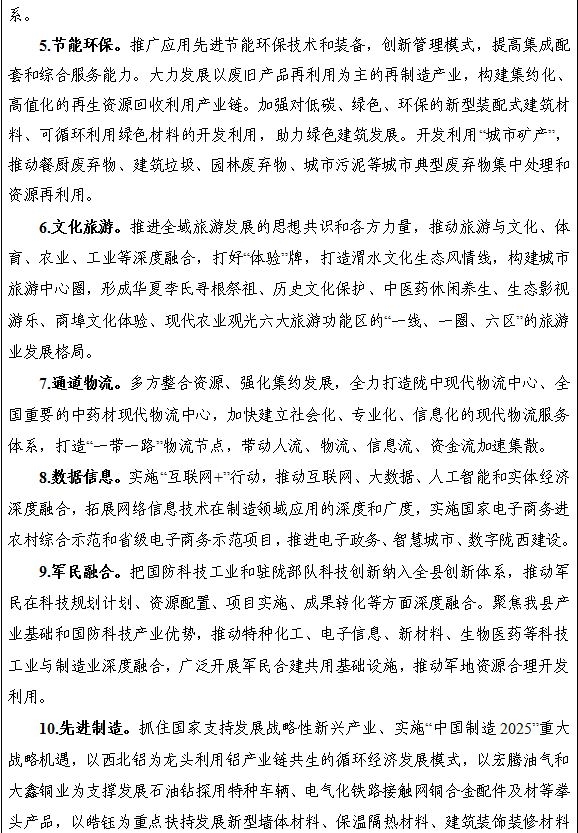 坚持把发展“十大生态产业”作为主攻方向,紧紧围绕全县中医药、马铃薯、草牧、铝冶炼及加工等特色优势产业,通过强龙头、补链条、聚集群、建平台,立足新技术、新业态,全力促进产业转型升级,优化一产、做强二产、提升三产,积极发展生态产业,加快发展数字经济,构建完善的现代产业体系,提升产业链供应链现代化水平,推动县域经济绿色转型发展。