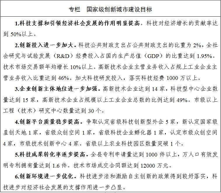 坚持创新在现代化建设全局中的核心地位,深入实施创新驱动发展战略,坚持问题导向和目标导向相统一,通过深化改革破解发展难题,更加注重改革的系统性、整体性、协同性,围绕增强发展内生动力、激发市场活力,纵深推进关键领域和重点环节改革,以改革倒逼发展,释放改革红利,全面激发一切创新主体活力,着力打通科技成果转移转化通道,充分发挥科技创新的战略支撑和引领作用,积极创建国家创新型县。