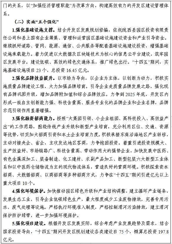 (4)全面推进开发区扩容升级。进一步理顺体制机制,按照“城-人-产”融合发展为目标,坚持以“六个突破、五个强化”为方向,把开发区建设成为“项目建设聚集区、循环经济示范区、高新技术孵化区、深化改革先导区”,确保到“十四五”末入驻企业总数达到1000家以上,地区生产总值达到25亿元,工业增加值13亿元,成功申报为省级高新技术产业开发区,创建国家级高新区。