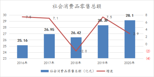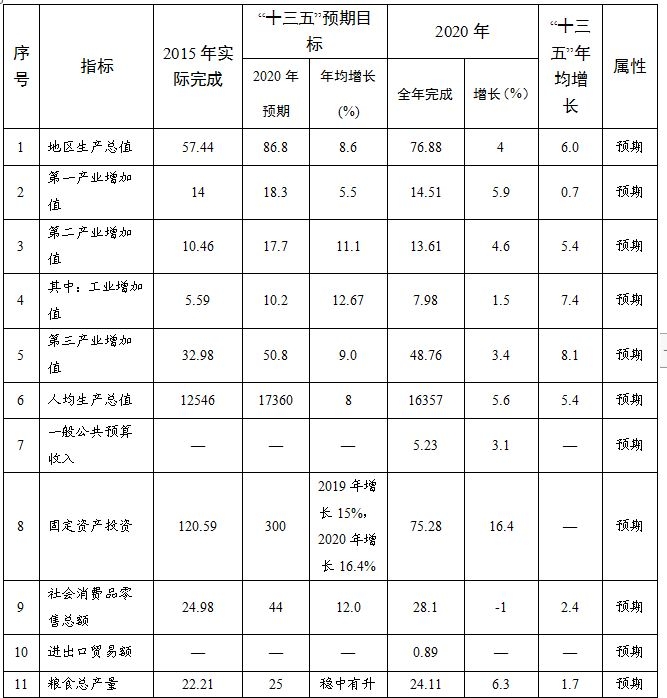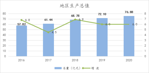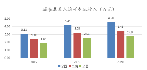 综合实力显著增强。“十三五”期间,全县地区生产总值达到337.02亿元,是“十二五”时期的1.38倍,年均增长6.6%,人均GDP达到16316元。完成固定资产投资404.92亿元。社会消费品零售总额达到136.12亿元,是“十二五” 时期的1.38倍,年均增长6.5%。一般公共预算收入达到24.68亿元,是“十二五”时期的1.45倍,年均增长7.7%。到2020年底,城乡居民人均可支配收入分别达到26893.2元和9781元,较“十二五”末分别净增8053.2元和3393元。