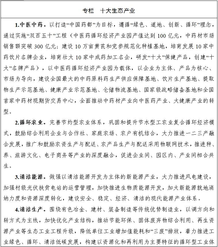 ——转型升级实现突破。做实做强做优实体经济,产业发展迈向中高端,推动以中医药加工、铝冶炼及加工、特色农产品加工、装备制造、化工建材、新型包装等为主的产业集群信息化、智能化、全产业链发展,积极发展十大生态产业,不断壮大实体经济规模,力争2025年工业化率达到20%以上,战略性新兴产业产值占规模工业总产值比重达到40%以上,十大生态产业增加值比重达到50%以上,新产业、新业态、新技术引领作用显著增强,初步建立成长性较好、自主创新能力较强、竞争优势明显的现代产业体系。