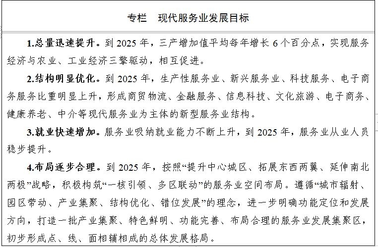 3.提升三产,全力促进消费提档升级。着力增强消费对经济发展的基础性作用,主动参与国内国际“双循环”,按照“城市辐射、园区带动、产业集聚、结构优化、错位发展”的理念,进一步加快服务产品和服务模式创新,促进生产性服务业与特色优势产业融合,加快提升生活性服务业,积极培育新兴服务业,促进文化旅游融合发展,实施“提升中心城区、拓展东西两翼、延伸南北两极”战略,加快“互联网+”在服务业领域的应用与融合,推动生产性服务业向专业化和价值链高端延伸,生活性服务业向精细和高品质转变,培育形成2(商贸物流、现代会展)+N(文化旅游、养老养生等)的现代服务业产业体系,积极构筑“一核引领、多区联动”的服务业空间布局。