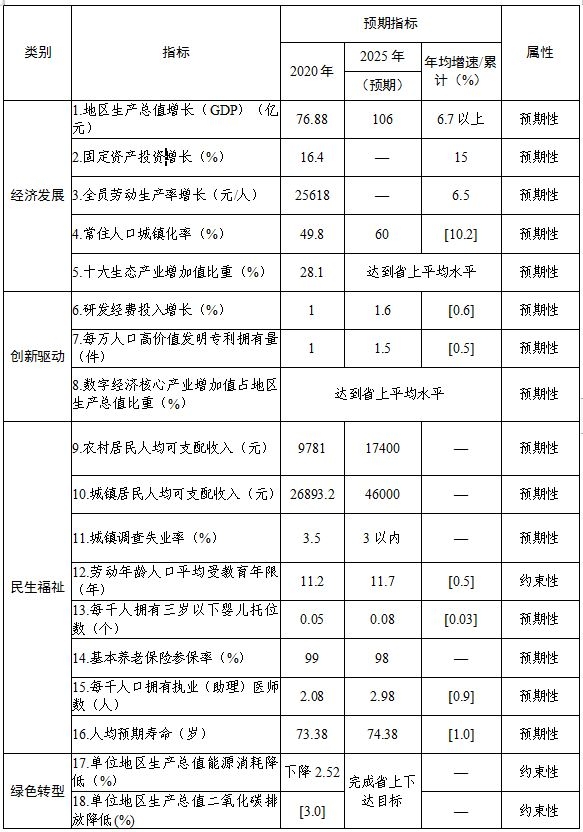 ——综合实力显著提升。在发展质量和效益全面提升的基础上,保持经济中高速增长,地区生产总值突破百亿元大关,年均增长6.7%以上;一二三产业结构比更加优化,三产比调整为17:24:59;固定资产投资年均增长15%,“十四五”末达到150亿元以上;一般公共预算收入年均增长13%,“十四五”末达到10亿元以上;城镇居民人均可支配收入年均增长8%以上,农村居民人均可支配收入年均增长11%以上,经济社会发展主要指标始终保持全省各县区前列,综合实力、竞争力和可持续发展能力显著增强。