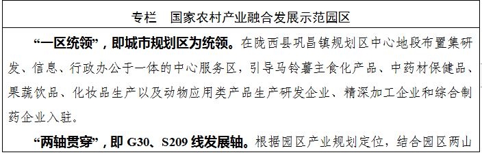 (2)建设国家农村产业融合发展示范区。按照“农业内部融合、多业态复合”的发展思路和“一区、两轴、四板块,即:一区统领、两轴贯穿、四大板块融合”的空间布局,以提高农业农村综合生产能力为出发点,以创新农业经营机制为动力,以健全农业综合服务体系为保障,围绕“中药材、草牧、马铃薯、果菜”四大主导产业,优化园区产业空间发展布局,着力打造适合陇西县农村产业融合发展的示范样板和平台载体,推动产业聚集和转型升级,突出模式创新,使其在引领现代农业建设、培育农村发展新动能中发挥“加速器”的作用,在产业融合、农户带动、技术集成、就业增收等方面,引领农业供给侧结构性改革,打造农村产业融合发展园区。
