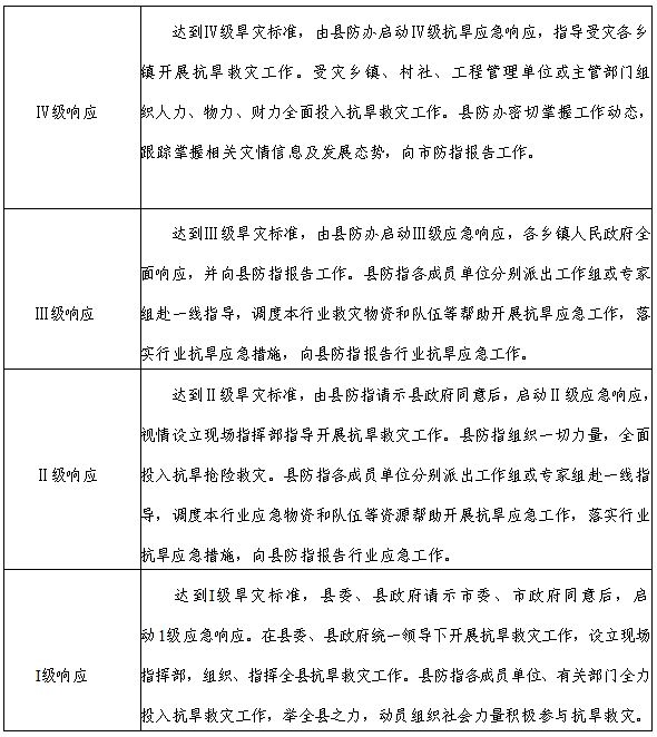 Ⅰ级应急响应由县委、县政府决定启动,Ⅱ级应急响应由县政府决定启动,Ⅲ级应急响应由县地质灾害应急指挥部启动,Ⅳ级应急响应由县地质灾害应急指挥部办公室启动。