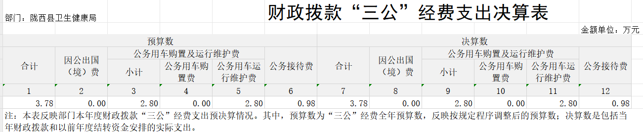 十一、“三公”经费:指用一般公共预算财政拨款安排的因公出国(境)费、公务用车购置及运行维护费、公务接待费。其中,因公出国(境)费反映单位公务出国(境)的国际旅费、国外城市间交通费、住宿费、伙食费、培训费、公杂费等支出;公务用车购置费反映单位公务用车购置支出(含车辆购置税);公务用车运行维护费反映单位按规定保留的公务用车燃料费、维修费、过路过桥费、保险费、安全奖励费用等支出;公务接待费反映单位按规定开支的各类公务接待(含外宾接待)支出。