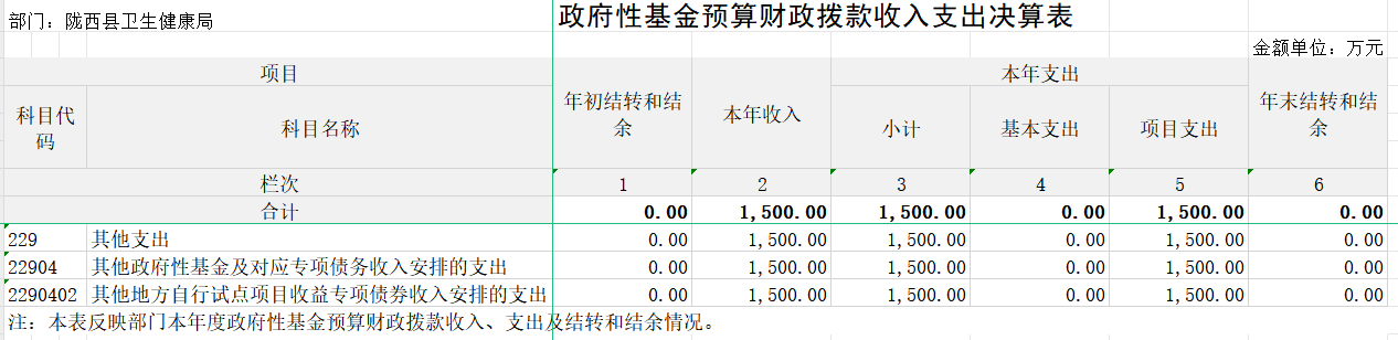 2022年度政府性基金预算财政拨款年初结转和结余0.00万元,本年收入1500.00万元,本年支出1500.00万元,年末结转和结余0.00万元,支出具体情况如下:其他地方自行试点项目收益专项债券收入安排的支出。