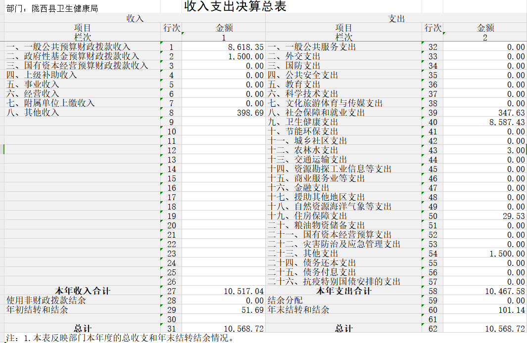 2022年度收、支总计均为10568.72万元。与上年度相比,收、支总计各增加6113.84万元,增长137.24%,主要原因是2022年基本公共卫生项目资金收支计入决算数据。