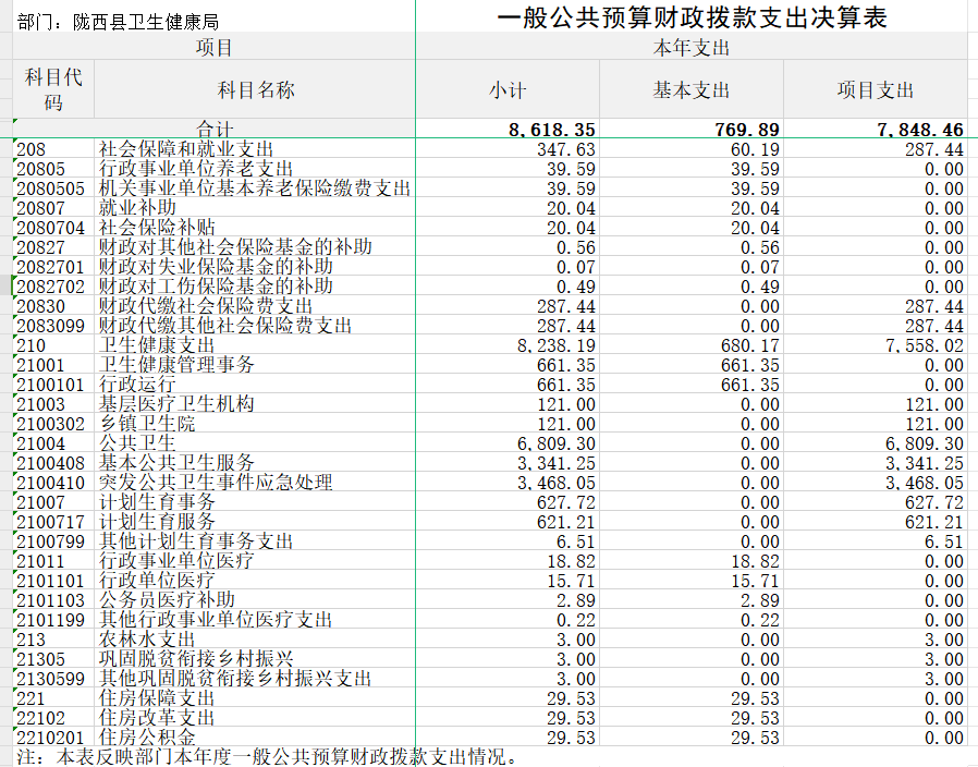 2.卫生健康支出。年初预算数为1602.97万元,支出决算为8238.19万元,完成年初预算的513.93%,决算数大于预算数的主要原因是2022年财政拨款基本公共卫生项目资金由主管部门统一支出;财政拨款职工人数增加,人员基本工资增长。