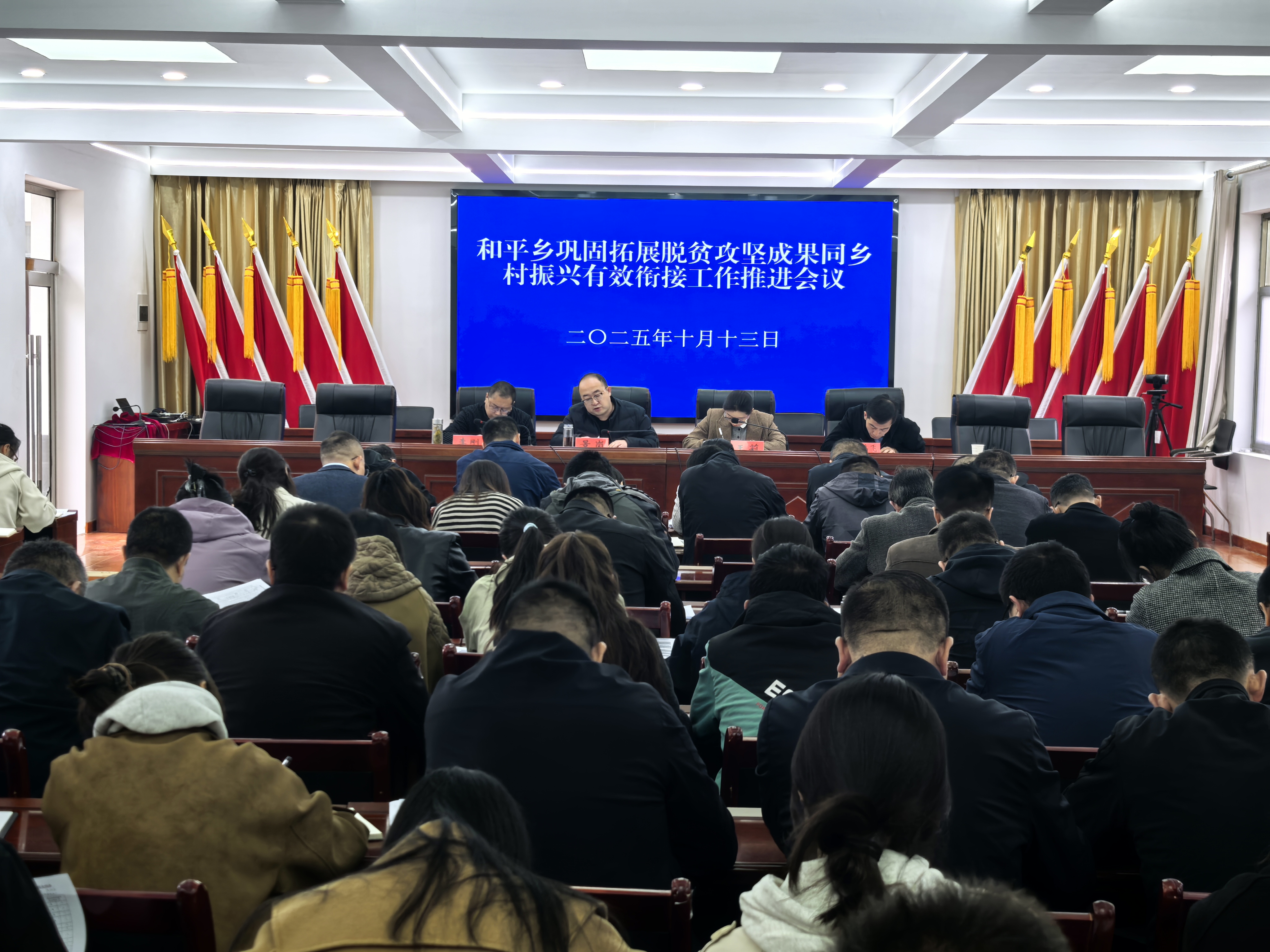 10月13日,和平乡组织召开巩固拓展脱贫攻坚成果同乡村振兴有效衔接工作推进会,全面部署冲刺阶段重点任务,确保各项工作落地见效。会议由乡党委书记景岗主持,全体乡村干部、驻村帮扶工作队所有成员参加。