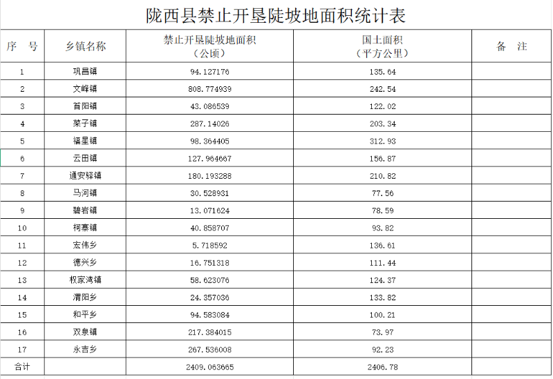一、全县禁止开垦陡坡地面积2409.0636公顷,涉及巩昌镇、文峰镇、首阳镇、菜子镇、福星镇、云田镇、通安驿镇、马河镇、碧岩镇、柯寨镇、宏伟乡、德兴乡、权家湾乡、渭阳乡、和平乡、双泉乡、永吉乡等17个乡镇,具体分布范围和面积见附件。
