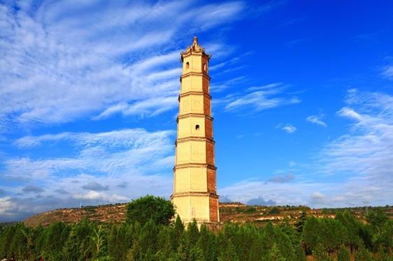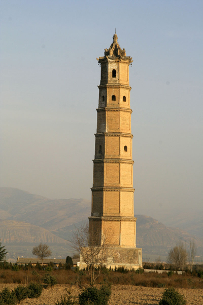 文峰塔,位于甘肃省定西市陇西县文峰镇迎春堡村南高约30米二级台地中央,侧北建一六角亭,亭对面不远处是塔坪庙院,东、北两侧各有人行道蜿蜒而上,南面有车行路道通向山梁,北面台地下有文(峰)鸳(鸯)公路经过,西北角是塔坪公路管理所。占地面积12.5平方米。是一座直径4米、高24米的七级八角楼阁式实心砖塔,由基座、塔身、塔刹组成。塔基方形,边长8米、高3米,塔身八角形,转角处砌成抹角倚柱,4—7级各面均有砖砌券形壁龛,层间叠涩出檐,檐下施菱角纹,顶层檐角安置铁制风铃,塔顶为八脊置兽攒尖式。刹为九重轮环的相轮,呈枣核状。此塔始建于明代,重建清道光十七年(1837),是定西市现存大型古塔实物中年代最早的一座具有较高的建筑和艺术价值,1981年被公布为县级文物保护单位。2011年12月公布为省级文物保护单位。