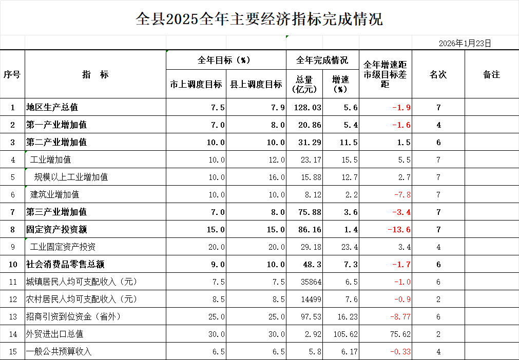 全县2025全年主要经济指标完成情况