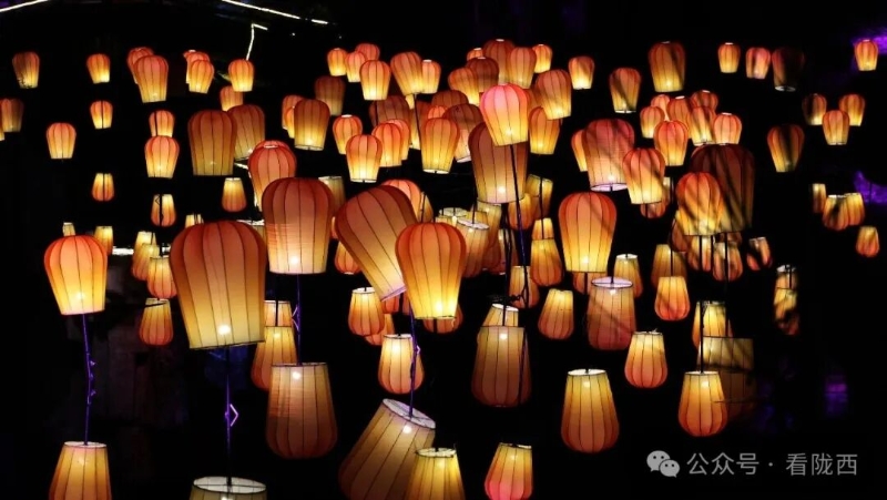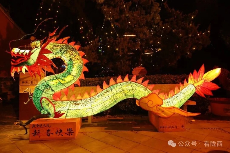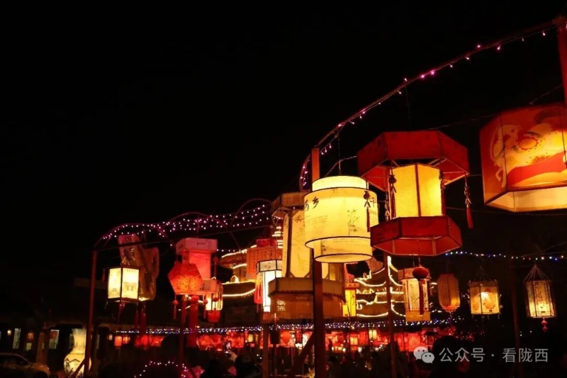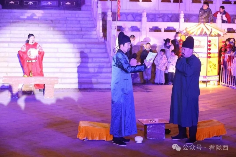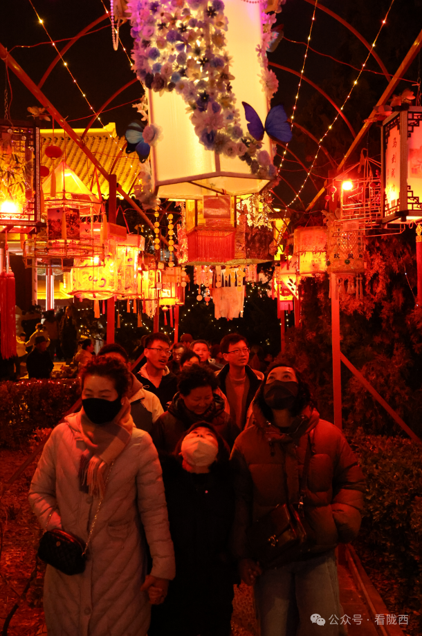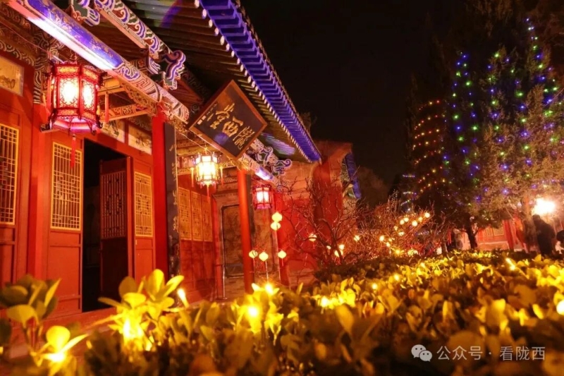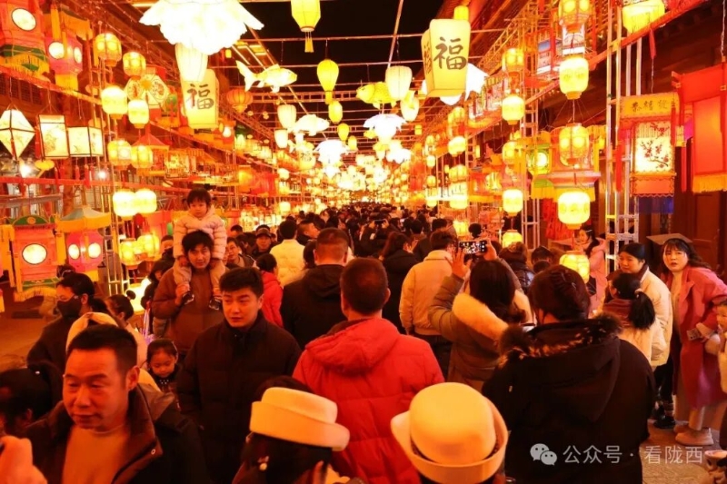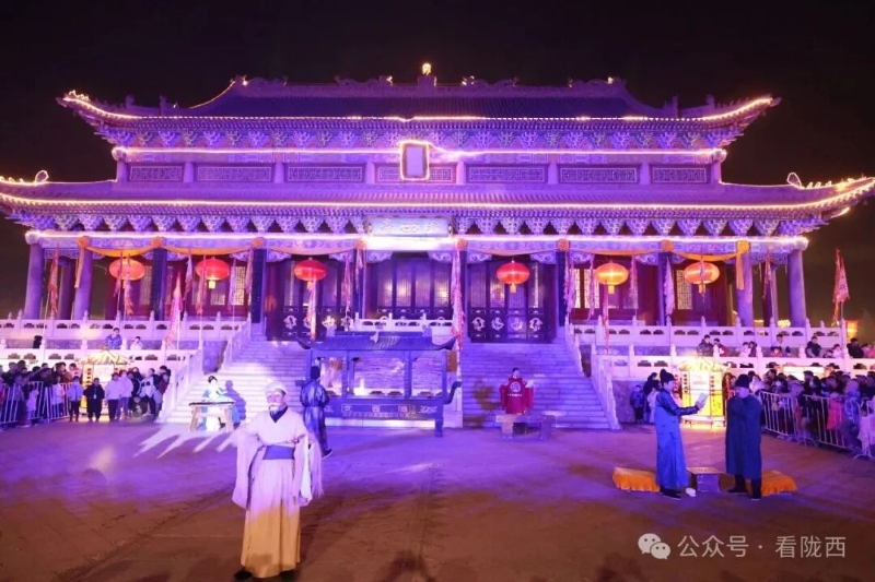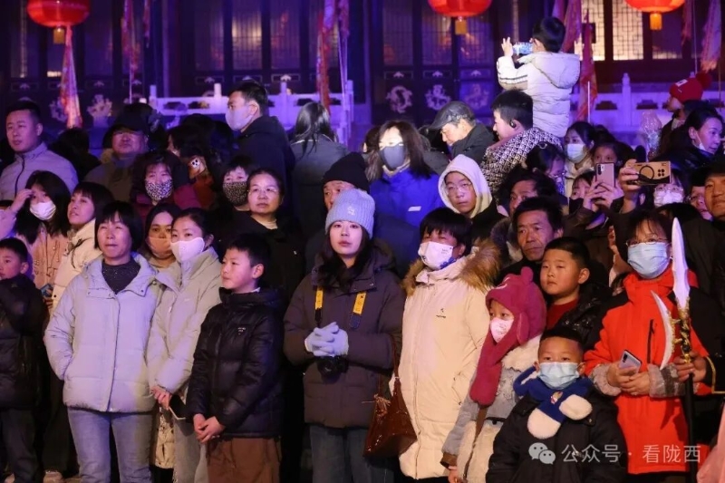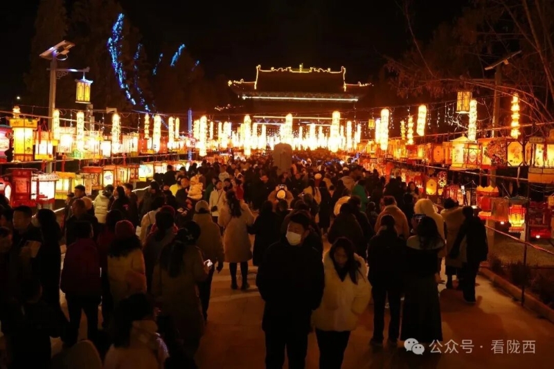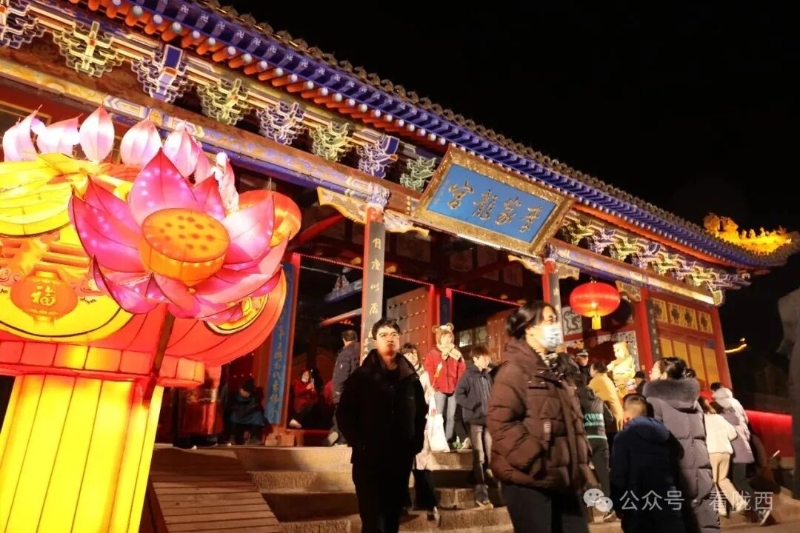 李家龙宫同样人山人海,热闹异常。龙宫景区内非遗灯展张灯结彩、造型各异,展示着传统灯饰的华彩魅力,衬托得殿堂楼阁更加古朴典雅。《梦回陇西堂》沉浸式演出华丽上演,一景一情间,尽显陇西李氏文化深厚底蕴。