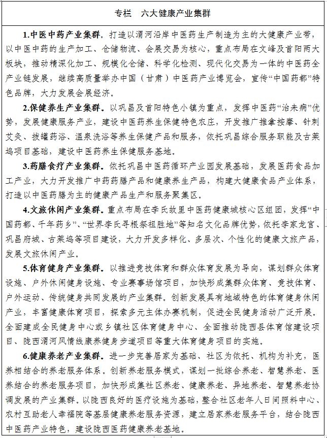 ——建设中国药都。立足“千年药乡”、“西北药市”和“天然药仓”的资源优势,以中医药全产业链标准化生产和转型升级为目标,以中国甘肃·陇西中医药信息物流港为载体,以中医药循环经济产业园为平台,推进中药材产业向中医药产业、大健康产业全面转型,持续办好国家中医药产业博览会,把陇西建成全国大宗道地中药材生产基地、国家中药原料药生产供应保障基地、国家中药材战略储备基地、国家中医药产业发展综合试验区核心区和国家西部中药材现期货交易中心。