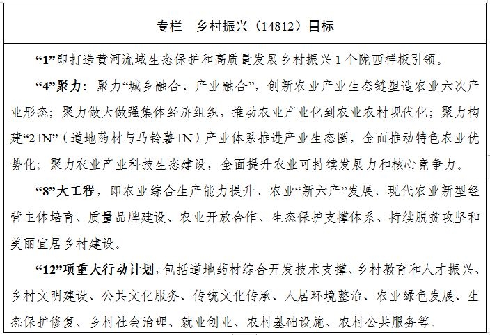 (3)着力调整优化农业产业结构。按照“种粮稳药,种菜扩薯”的思路,全面提升中药材标准化、草畜一体化、马铃薯主食化、果菜产业化发展质量,确保“十四五”末粮经比和夏秋比调整为70:30和12.5:87.5,期末总量达到18亿元,增加值年均增长6%以上。