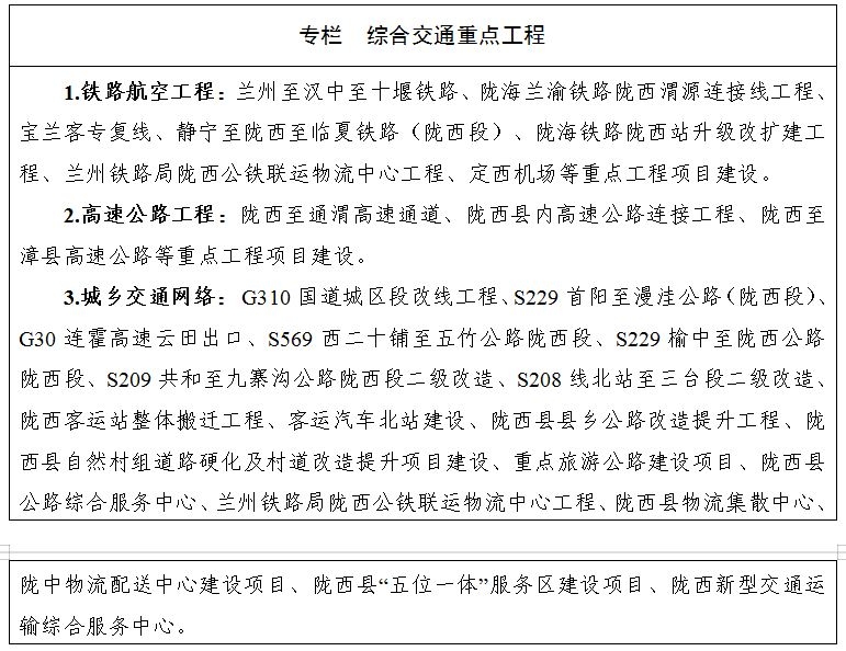 1.打造便利互通交通网络。坚持以多中心、网络化为主形态,完善多层次网络布局,优化存量资源配置,扩大优质增量供给,统筹铁路、公路、邮政等基础设施规划建设,实现立体互联,增强系统弹性,建成区域交通强县。立足全县交通发展的短板弱项,积极配合抓好定西民用机场建设,全力争取兰州至汉中至十堰铁路、陇海兰渝铁路连接线、宝兰客专复线规划建设,启动静宁至陇西至合作铁路陇西段前期工作,打通陇西至通渭高速公路通道,构建高品质、快速度的综合立体交通网络。加快建成广覆盖的城乡交通基础设施网,规划建设绕城快速通道,合理布局轨道交通建设,实施公路升级改造工程,实现通周边县区二级公路全覆盖(其中,G310和S209达到一级公路标准),通乡公路90%以上达到三级公路技术标准,通村公路达到小交通量农村公路工程技术标准,自然村组道路实现全部硬化,建设运行高效、服务优质的县级区域城乡道路干线网,实现乡乡通国省道、村村通沥青(水泥)路、社社通硬化路,农村客运网络及物流节点全覆盖,村邮站和快递服务网点全覆盖,打造现代化高质量的综合立体交通网络体系。
