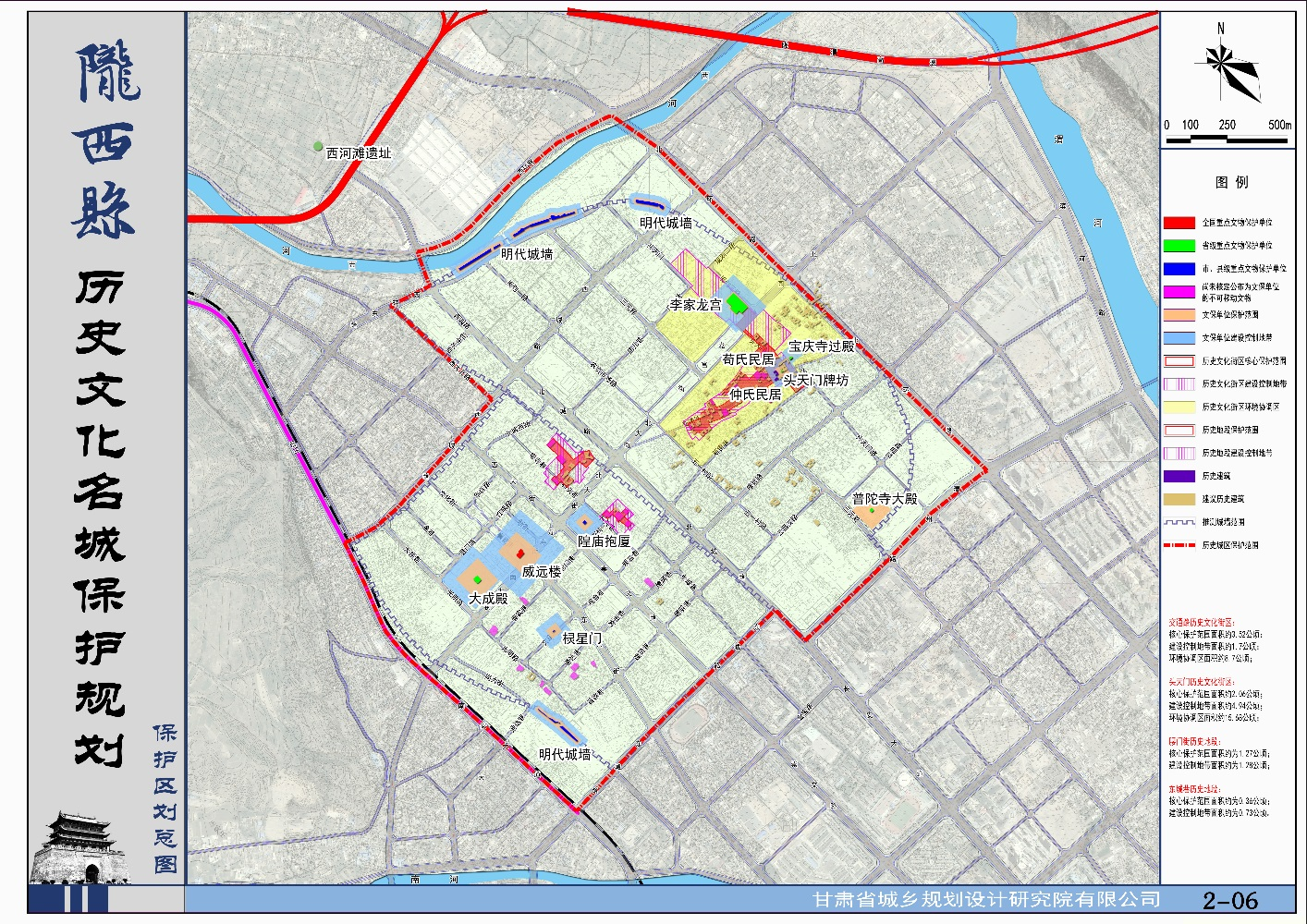 历史文化街区层面根据法律法规要求,划定两个历史文化街区。交通路历史文化街区核心保护面积3.52公顷,以交通路为轴线,两侧传统民居为重点保护区域,集中展示陇西传统风貌。头天门历史文化街核心保护面积2.06公顷,打造李氏文化的空间轴线,作为展示李氏文化的核心空间载体。此外,划定腰门街、东城巷两个历史地段保护,依托街巷和黄土民居的传统肌理形成小规模集聚历史地段。