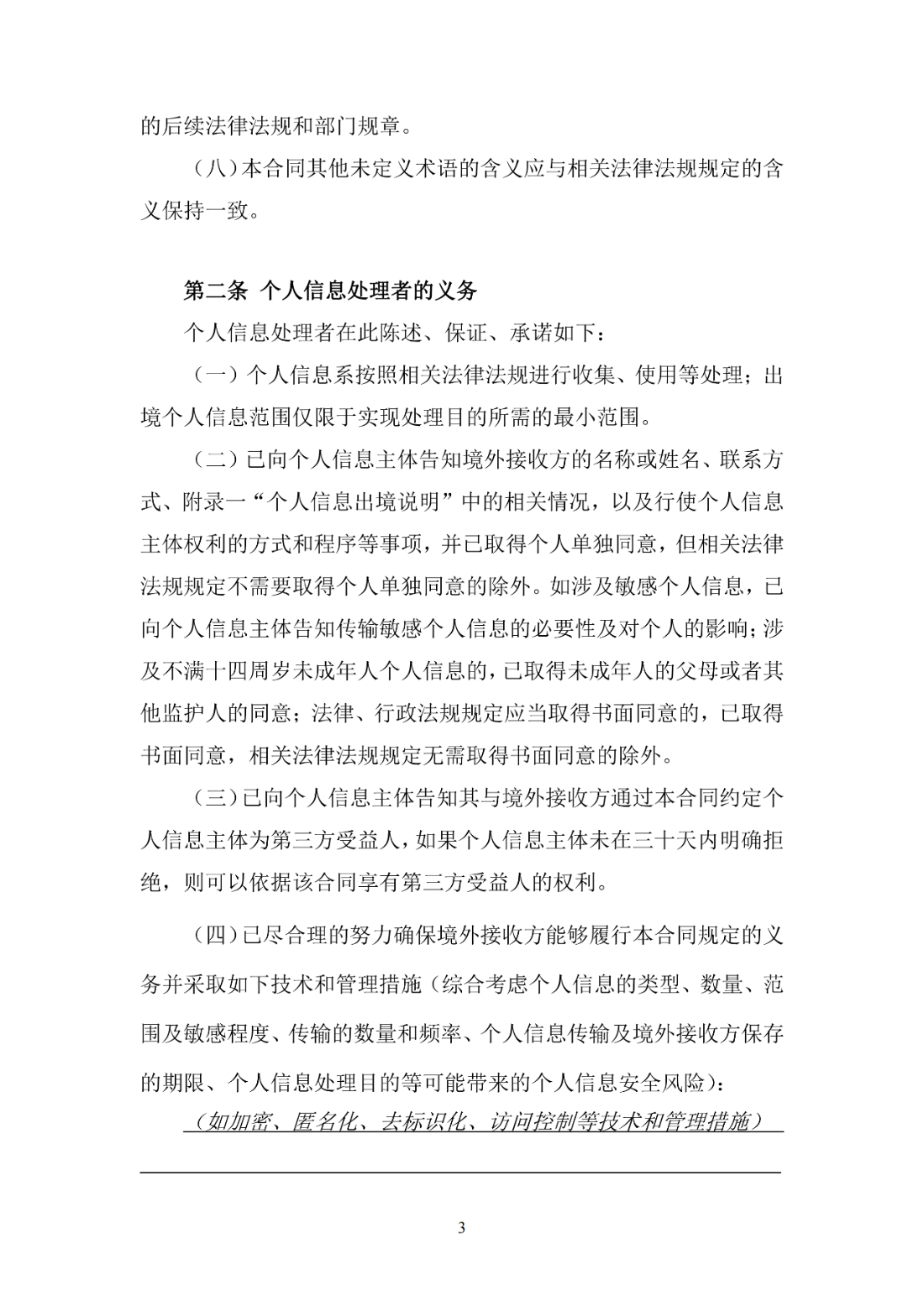 (三)个人信息处理者和境外接收方保护个人信息的责任与义务,以及为防范个人信息出境可能带来安全风险所采取的技术和管理措施等;
