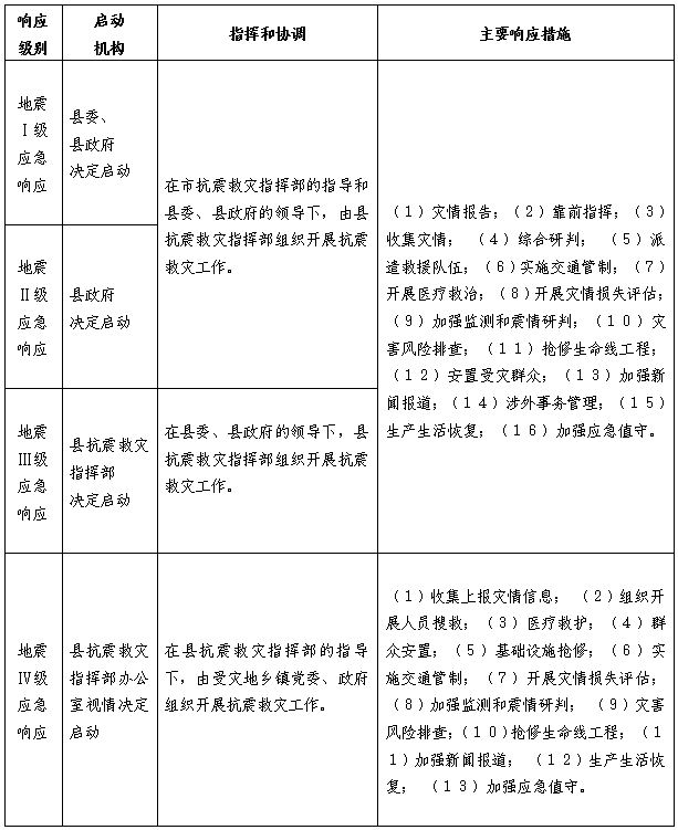 初判发生较大及以上地震灾害,在县委、县政府领导下,由县抗震救灾指挥部负责指挥协调和组织全县抗震救灾工作;初判发生一般地震灾害,在县抗震救灾指挥部指导下,由各乡镇党委、政府负责抗震救灾工作。涉及跨行政区域的,由县委、县政府统筹协调,受灾乡镇党委、政府负责本行政区域抗震救灾工作;当地震灾害超出乡镇党委、政府的应对能力时,由县委、县政府提供支援或者负责应对。