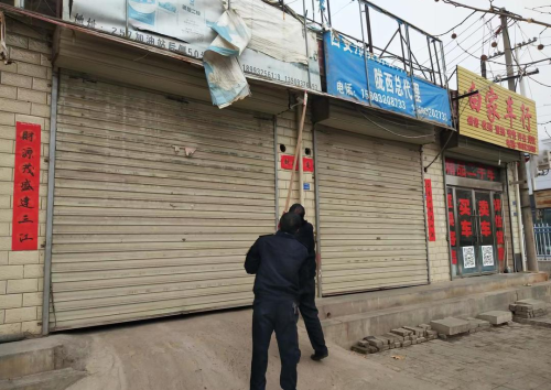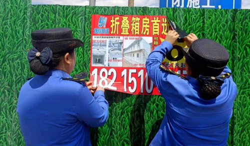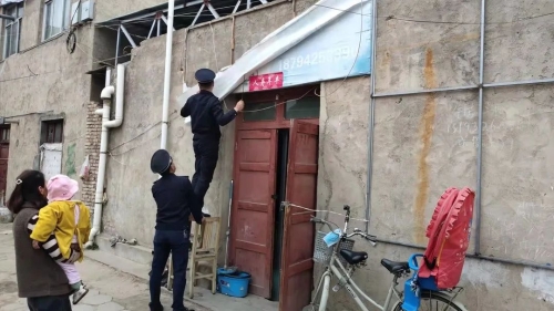 执法人员利用刷子、铲子等工具对涂刷、张贴的各类小广告进行粉刷、铲除。清理商铺破损广告、横幅等1100余条;涂抹覆盖“牛皮癣”5000余条,约500平方米。