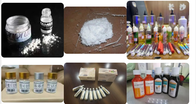 第三代毒 品:合成大麻素类(“上头”电子烟油)、卡西酮类(丧尸浴盐)、色胺类(死藤水)、y-羟基丁酸类(听话水、神仙水)等。