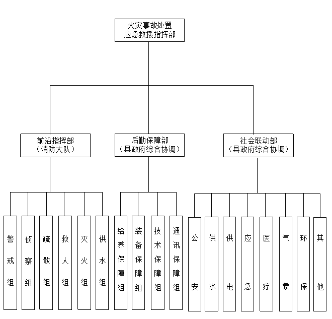 灭火指挥组:县消防救援大队牵头,负责制定灭火救援方案,组织指挥火灾扑救,营救被困人员,记录作战过程,报送救援信息;了解掌握火灾发展趋势,请求调集增援力量。