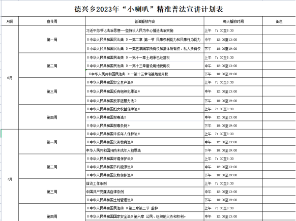 2023年下半年的“小喇叭”宣讲计划表也在持续重点推进法治宣传工作,六月民法典、 七月预防未成年人犯罪法、八月婚姻法、九月信访条例、十月社会主义核心价值观......小喇叭每天都会给大伙讲政策知识,坐在家里就能了解到跟自身切身利益密切相关的法律政策,持续增强了大众的法律意识及守法观念。