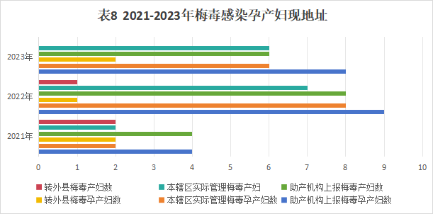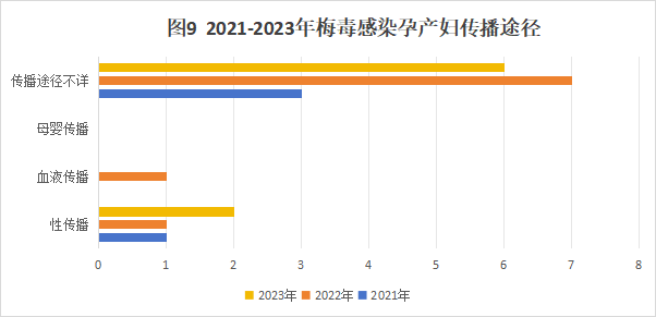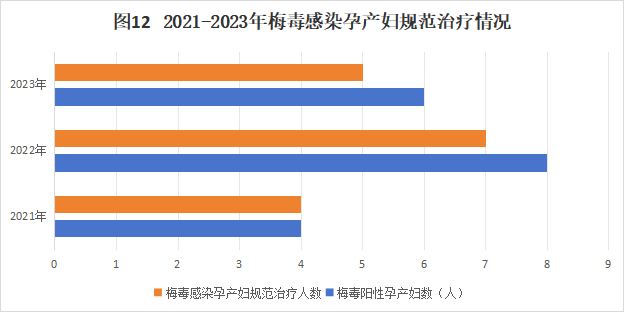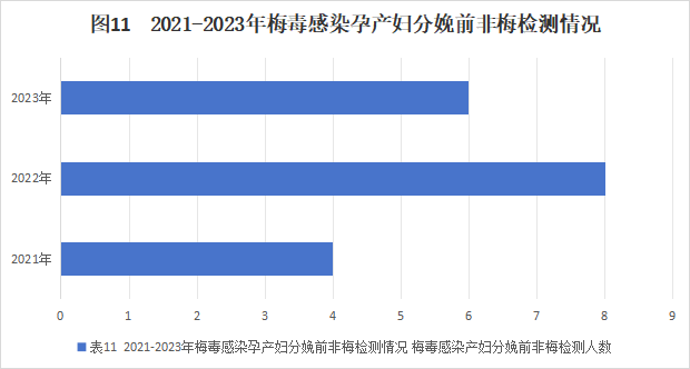 (9)2021-2023年,梅毒感染孕产妇所生婴儿先天梅毒上报0例,先天梅毒报告发病率0/10万。