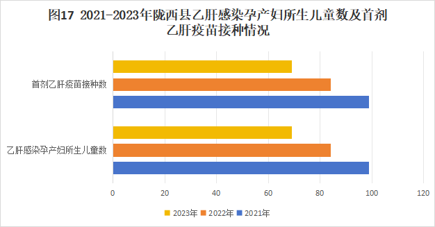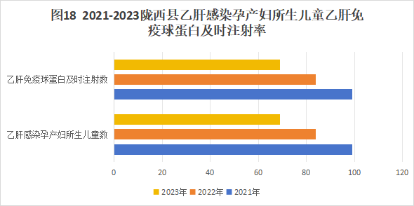 (4)2023年,乙肝表面抗原阳性孕产妇所生儿童69人,首剂乙肝疫苗接种69人,首剂乙肝疫苗接种率达100%。(表、图17)