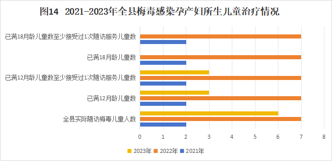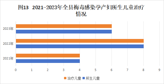 (7)近3年,梅毒感染孕产妇共21人,所生儿童18人,梅毒感染孕产妇接受诊疗的比例为95.24%,所生儿童接受诊疗的比例为100%。近几年,通过制定一系列切实可行的政策和措为95.24%,所生儿童接受诊疗的比例为100%。近几年,通过制定一系列切实可行的政策和措施,加强梅毒等性传播疾病的防控工作,包括提供免费或优惠的预防性治疗服务,加强医疗机构和基层卫生机构的协作,提高梅毒感染孕产妇所生儿童预防性治疗的覆盖率和质量等。再者,随着梅毒防治知识的普及和公众健康意识的提高,人们开始更加重视梅毒对母婴健康的危害,尤其是梅毒感染孕产妇所生儿童的风险,促使更多的家庭和医疗机构积极寻求预防性治疗措施,以确保儿童的安全。(表、图13) 表13 2021-2023年全县梅毒感染孕产妇所生儿童治疗情况 | |||
