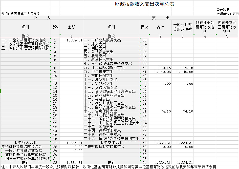 2023年度财政拨款收、支总计均为1334.31万元。与上年相比,各增加111.6万元,增长9.13%。主要原因是项目重大传染病防控资金增加,为上级专项资金。