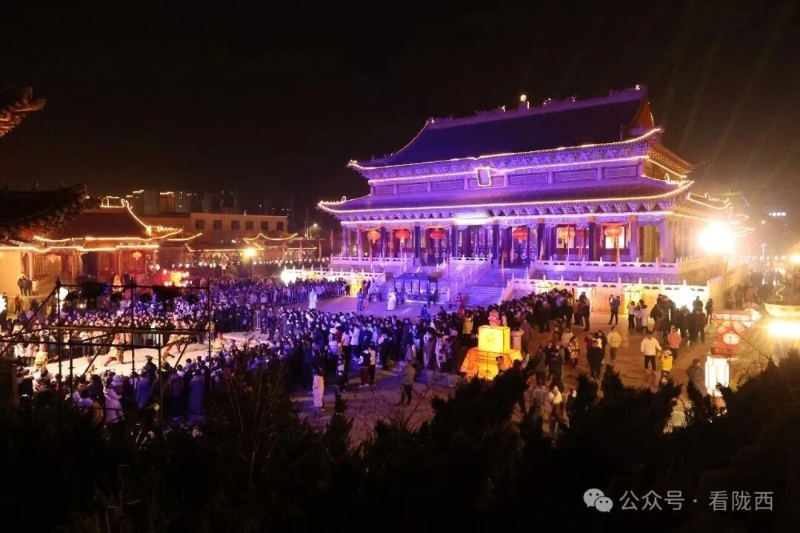 李家龙宫同样人山人海,热闹异常。龙宫景区内非遗灯展张灯结彩、造型各异,展示着传统灯饰的华彩魅力,衬托得殿堂楼阁更加古朴典雅。《梦回陇西堂》沉浸式演出华丽上演,一景一情间,尽显陇西李氏文化深厚底蕴。